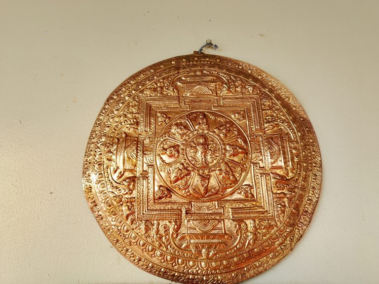 Alternative Text: A decorative round plaque made of a shiny, golden-colored metal. It features intricate carvings, including a central circular design surrounded by detailed borders with various ornamental patterns.