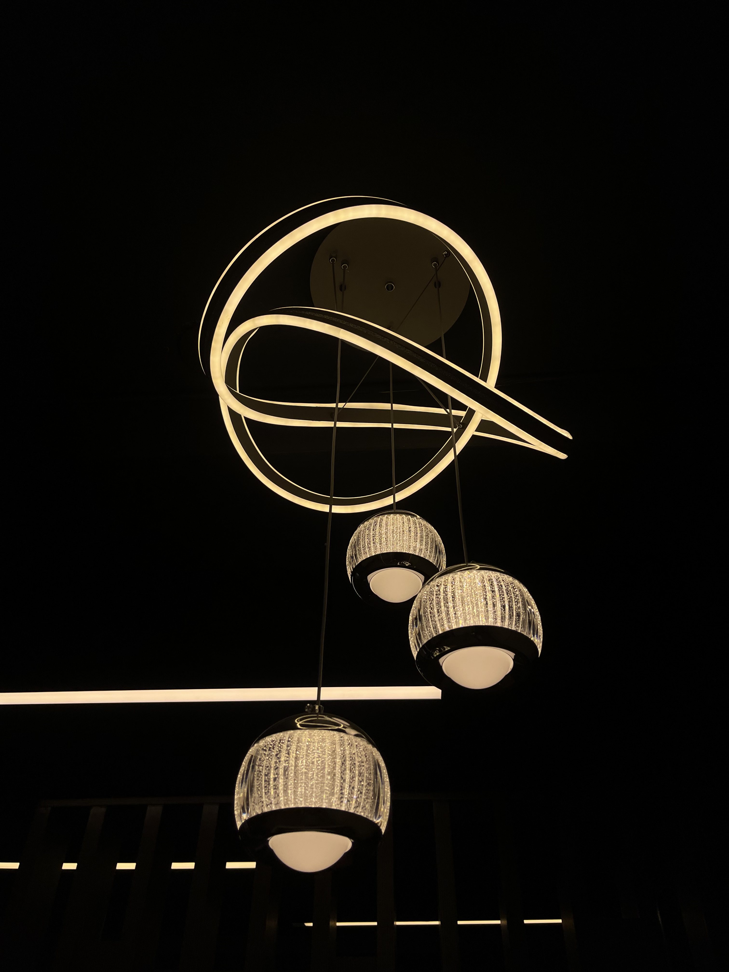 Alternative Text: A modern ceiling light with interlocking white LED rings and three clear glass globe pendants.