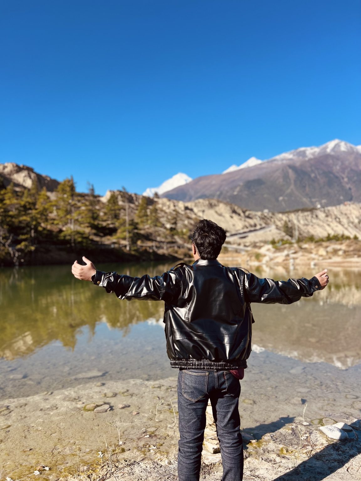Alternative Text: A person stands by a serene dhumba lake, facing away from the camera with their arms outstretched.