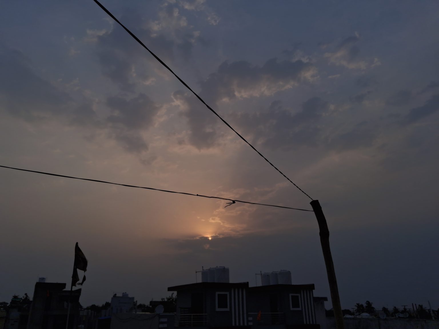 Alternative Text: A dramatic early-evening sky glows with a muted orange sun partially hidden behind thick clouds, as silhouetted buildings, flags, and crossing overhead wires cut through the frame, creating a moody and atmospheric scene.