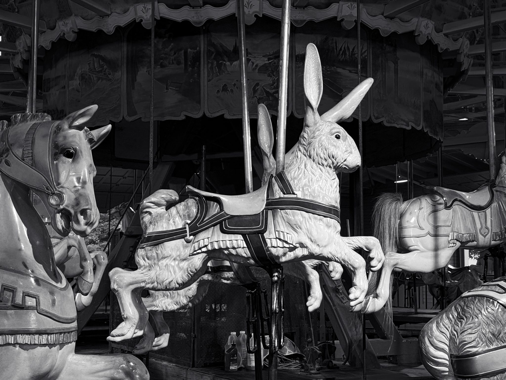 Alternative Text: An antique carousel featuring a ride-on wooden rabbit.