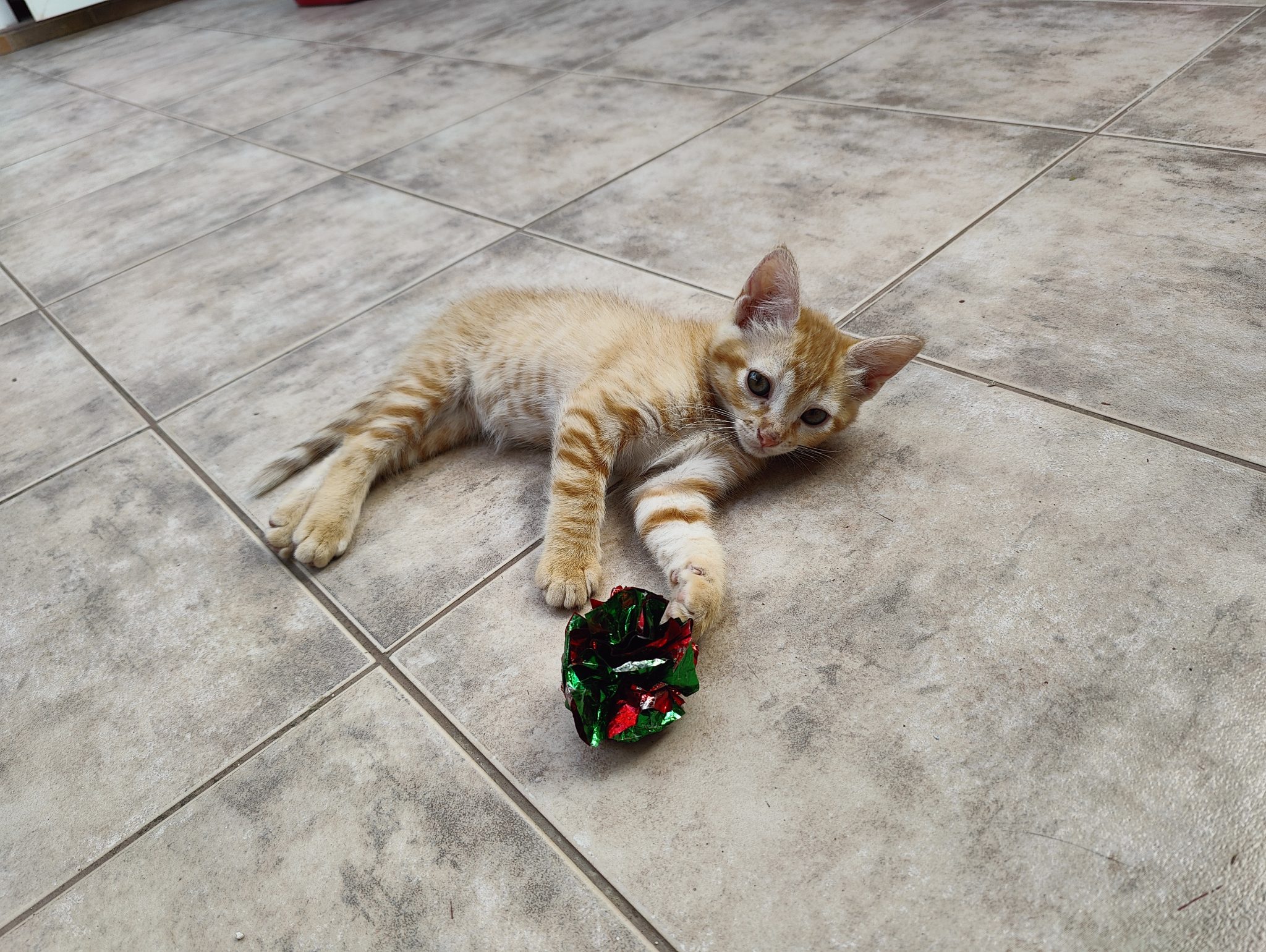 Alternative Text: A light orange kitten lies on a tiled floor, reaching out to a crumpled shiny object with its paw. The kitten has green eyes and is looking towards the camera.