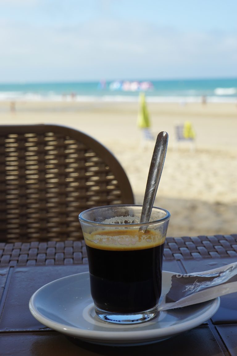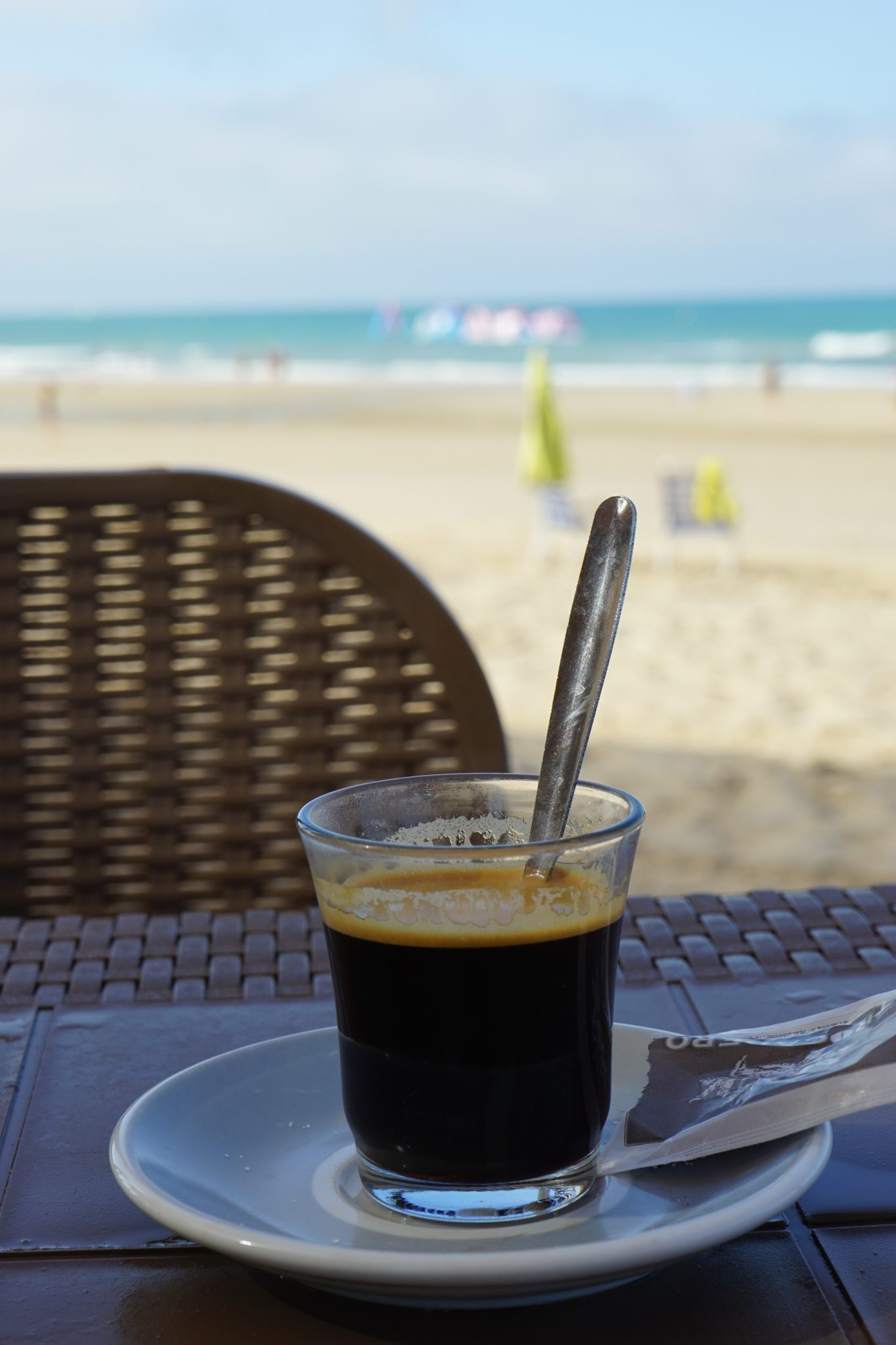 Alternative Text: A cup of espresso on a saucer with a teaspoon inside, placed on a wicker table with a blurred background