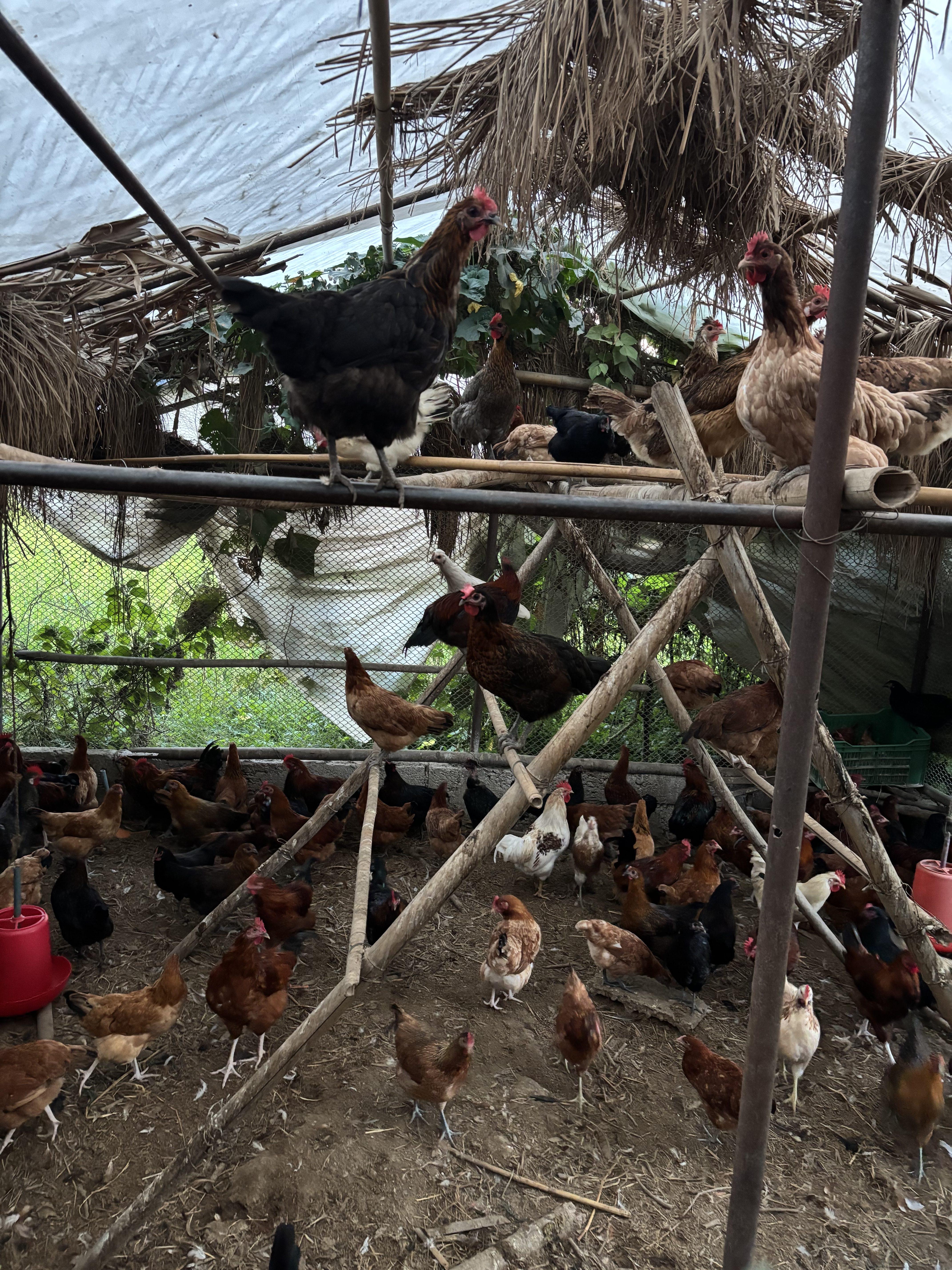 Alternative Text: A bustling chicken coop filled with various chickens of different colors and sizes. Some chickens are perched on wooden beams, while others are on the ground amidst dirt and straw.