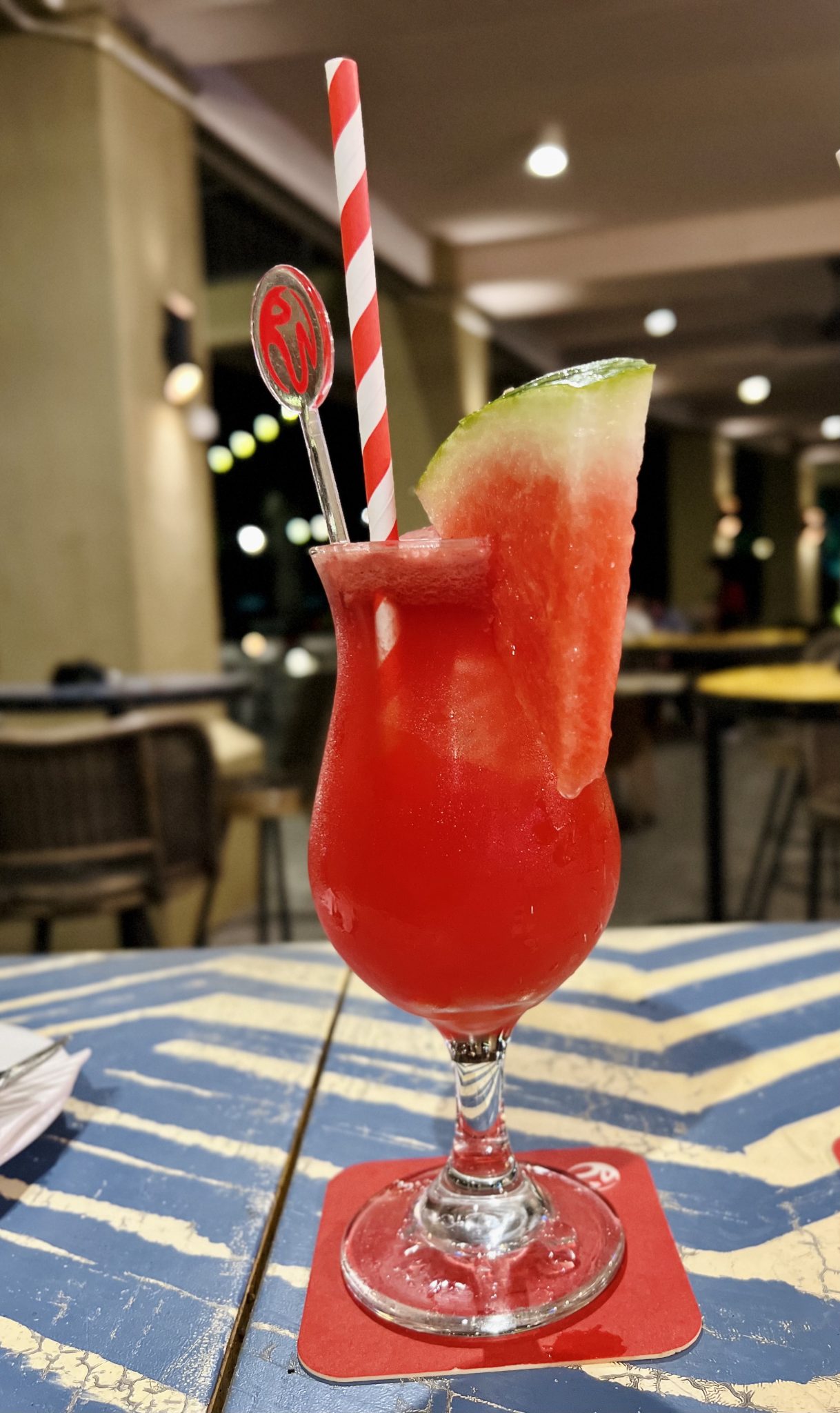 Alternative Text: A low-angle shot of a vibrant red watermelon drink served in a stemmed glass.