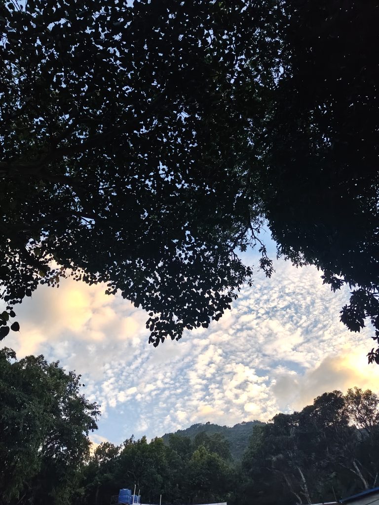 Alternative Text: Lush green branches frame a serene landscape with a pastel sky and a distant mountain peak.
