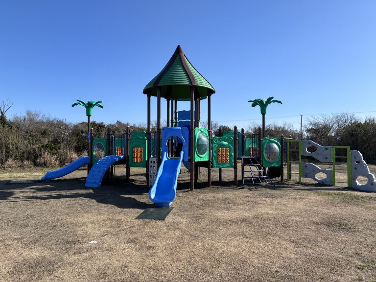 Alternative Text: A playground structure featuring a green and brown color scheme, with a peaked roof and palm tree-like decorations. It includes blue slides, climbing areas, and various interactive panels.
