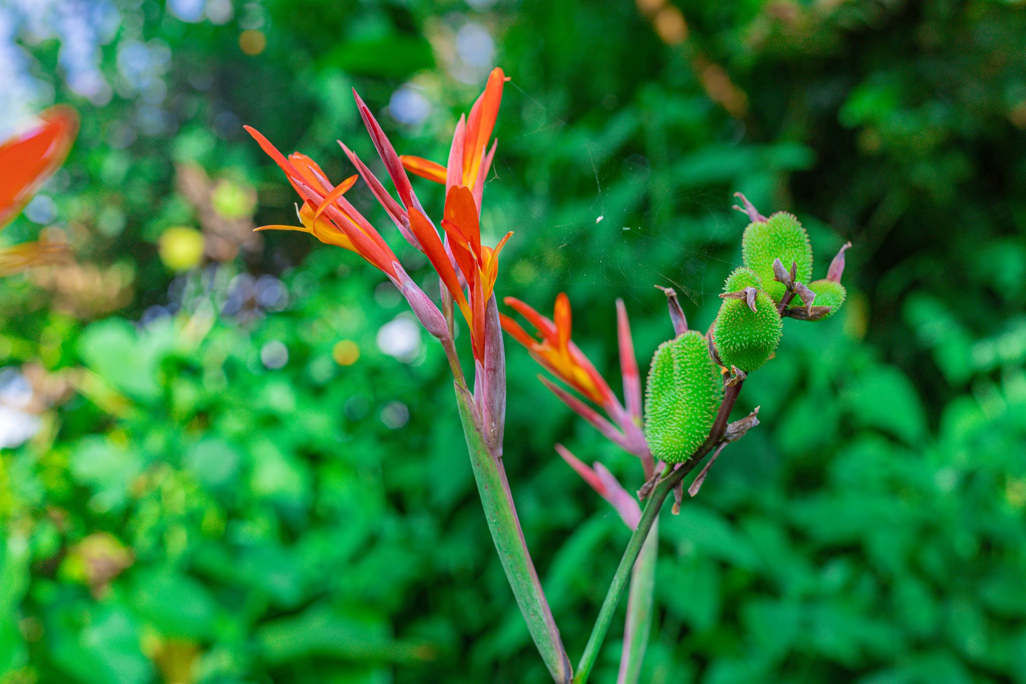 Alternative Text: Close-up of orange and yellow flowers with green foliage and seed pods in a tropical setting.