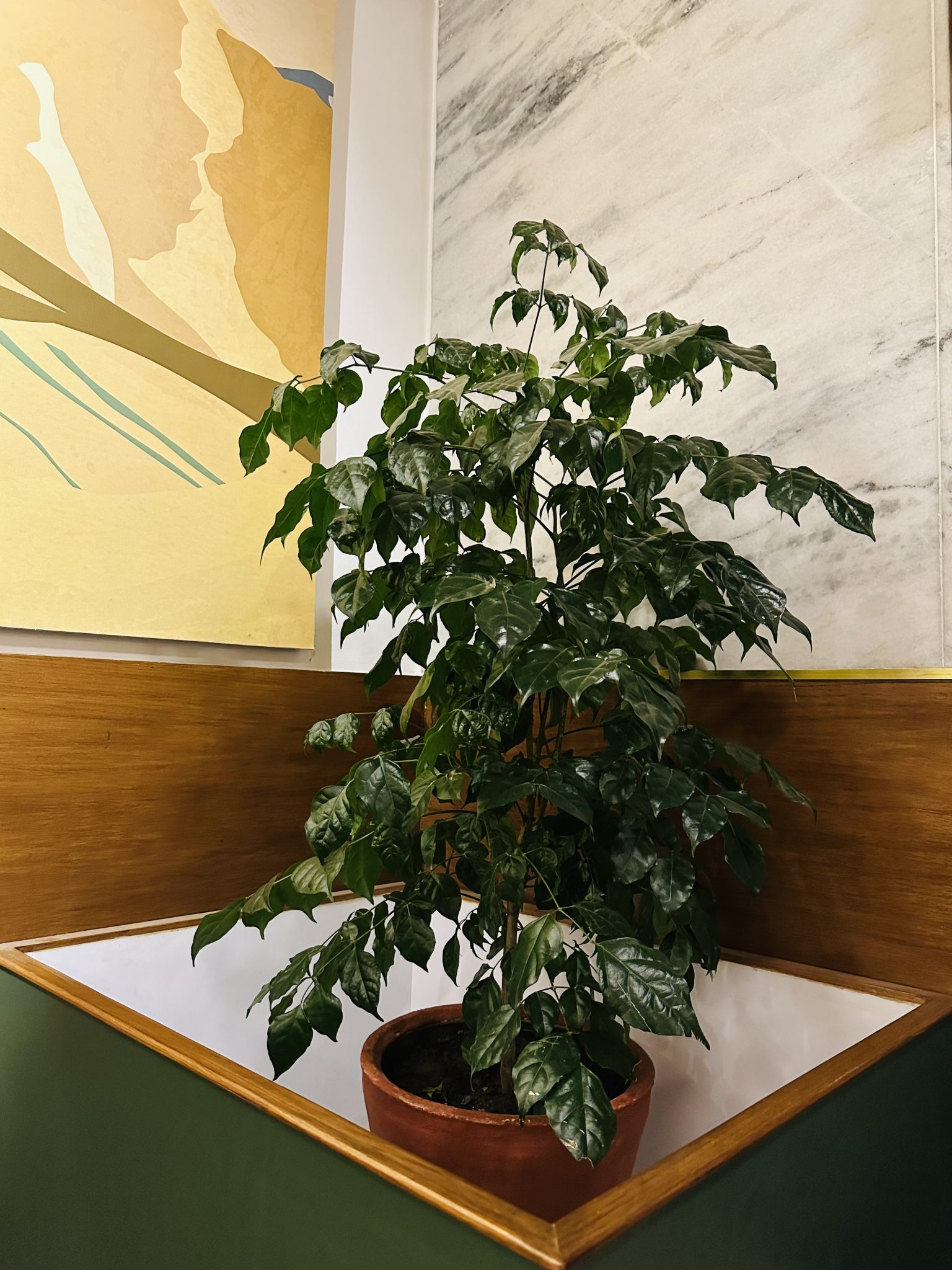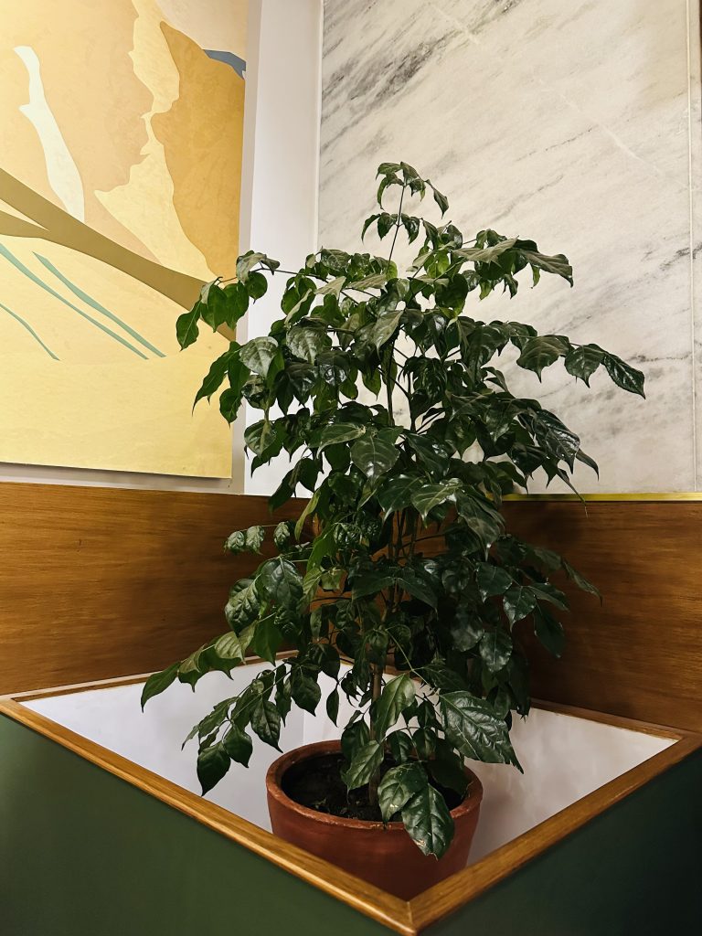 Alternative Text: A leafy green plant in a terracotta pot sits in the corner of a room with wooden paneling.