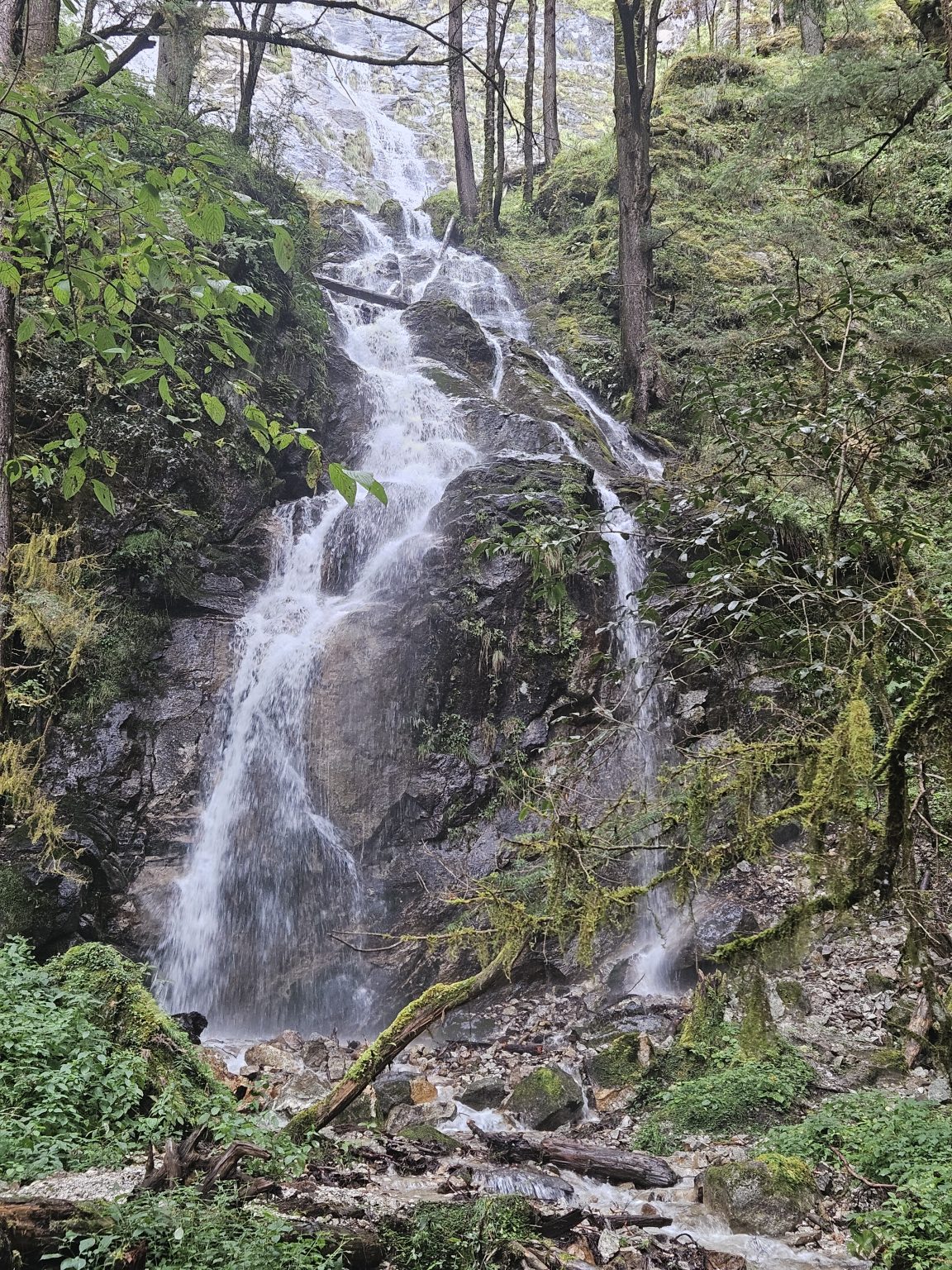 Alternative Text: A cascading waterfall flows down a rocky cliff surrounded by lush green vegetation and tall trees.