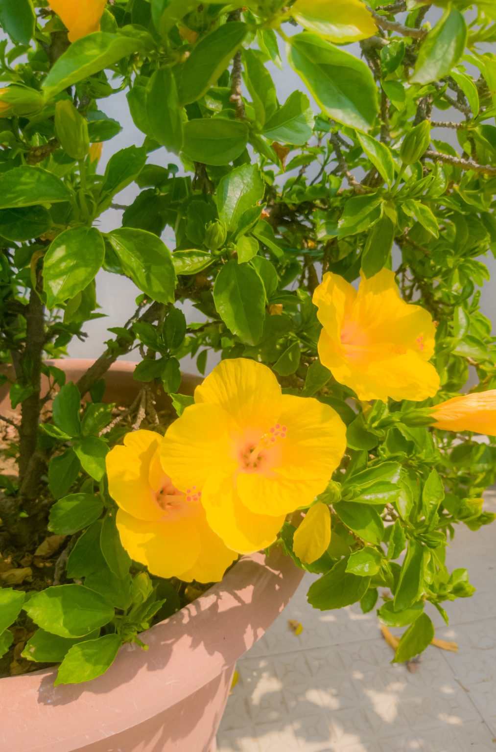 Alternative Text: A close-up of vibrant yellow hibiscus flowers blooming among lush green leaves in a terracotta pot.