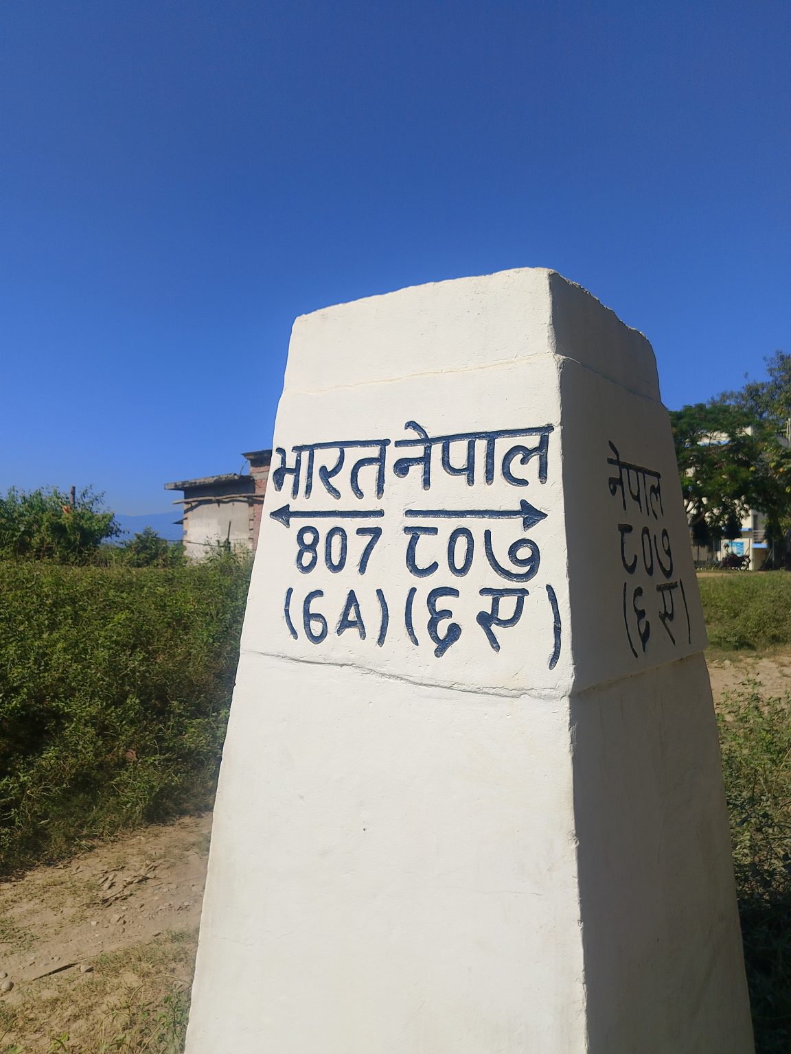 Alternative Text: A white concrete border pillar marking the boundary between India and Nepal under a clear blue sky. The text on the pillar is written in Devanagari script, with arrows pointing in opposite directions — one side labeled “भारत नेपाल” (India–Nepal) with numbers “807 (6A)” and the other labeled “नेपाल” (Nepal). The pillar stands in a grassy rural area with a small building and trees in the background.