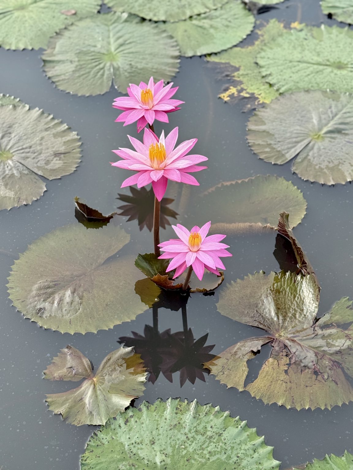 Alternative Text: Three vibrant pink water lilies bloom among green lily pads on a calm pond. Their reflections in the dark water create a peaceful nature scene. Captured in Vazhakkad, Malappuram.
