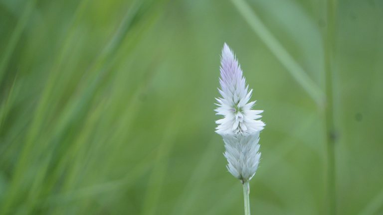 Alternative Text: Close-up of a single white and light purple wildflower spike against a blurred green background of grass.