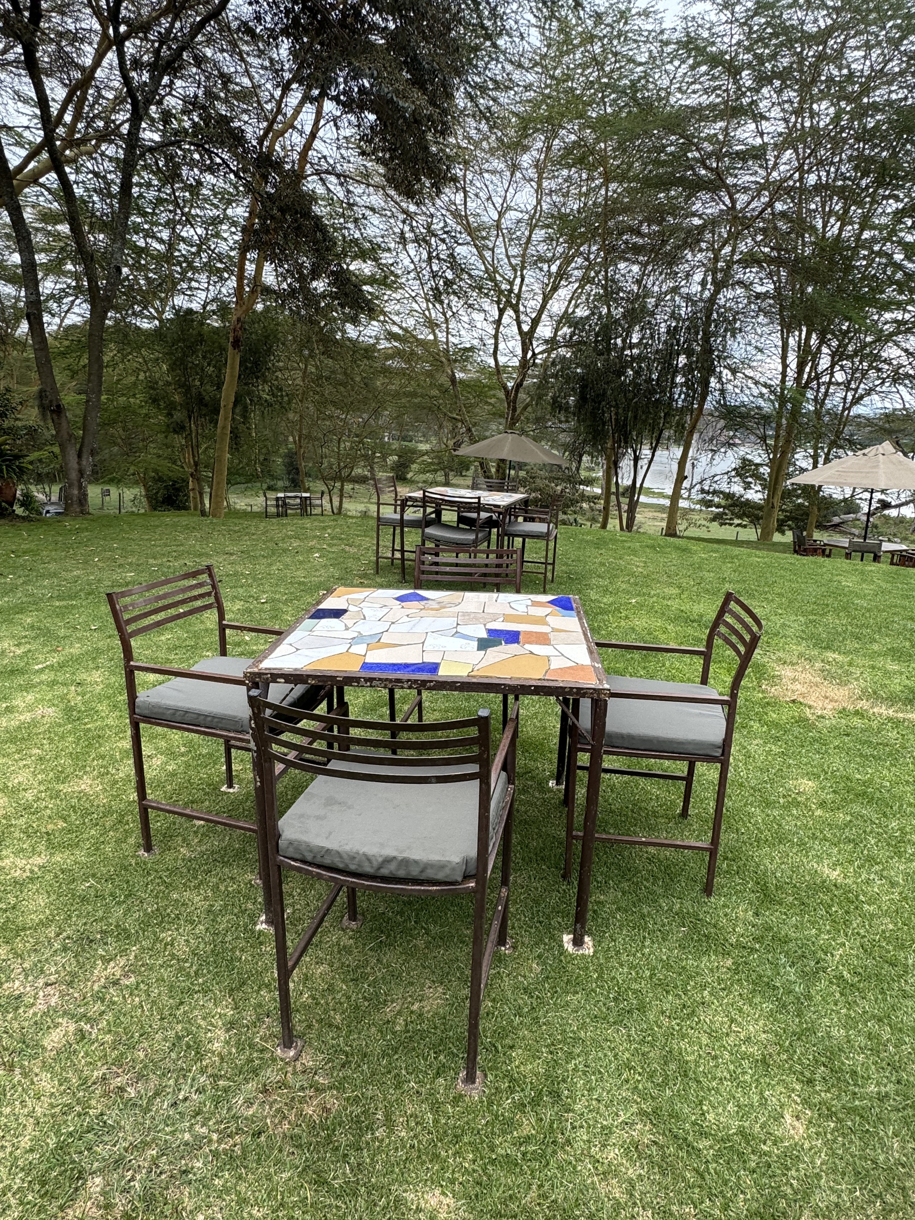 Alternative Text: A mosaic-tiled table and four chairs on a grassy lawn with tall trees and a lake in the background.