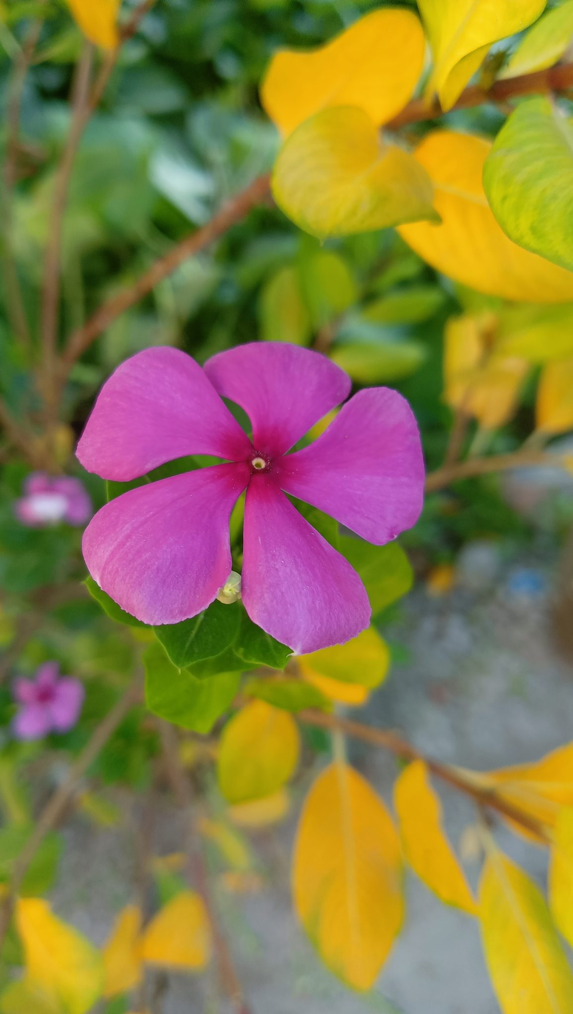 Alternative Text: A close-up of a vibrant pink flower with five petals, surrounded by green leaves and yellow leaves in the background.