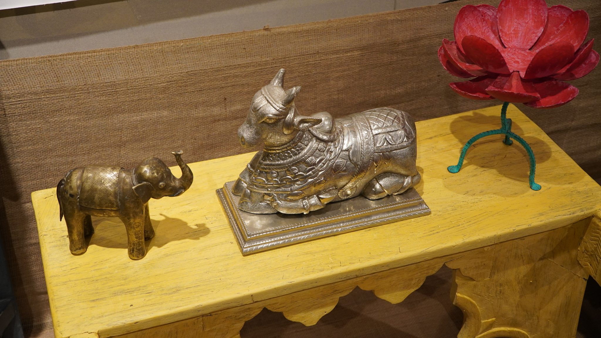 Alternative Text: A small statue of a copper elephant, silver bull called Nandi in hindu religion, and metal lotus gleamed, weaving tales of art and devotion placed on a wooden yellow coloured table, at a feast in Jaipur.