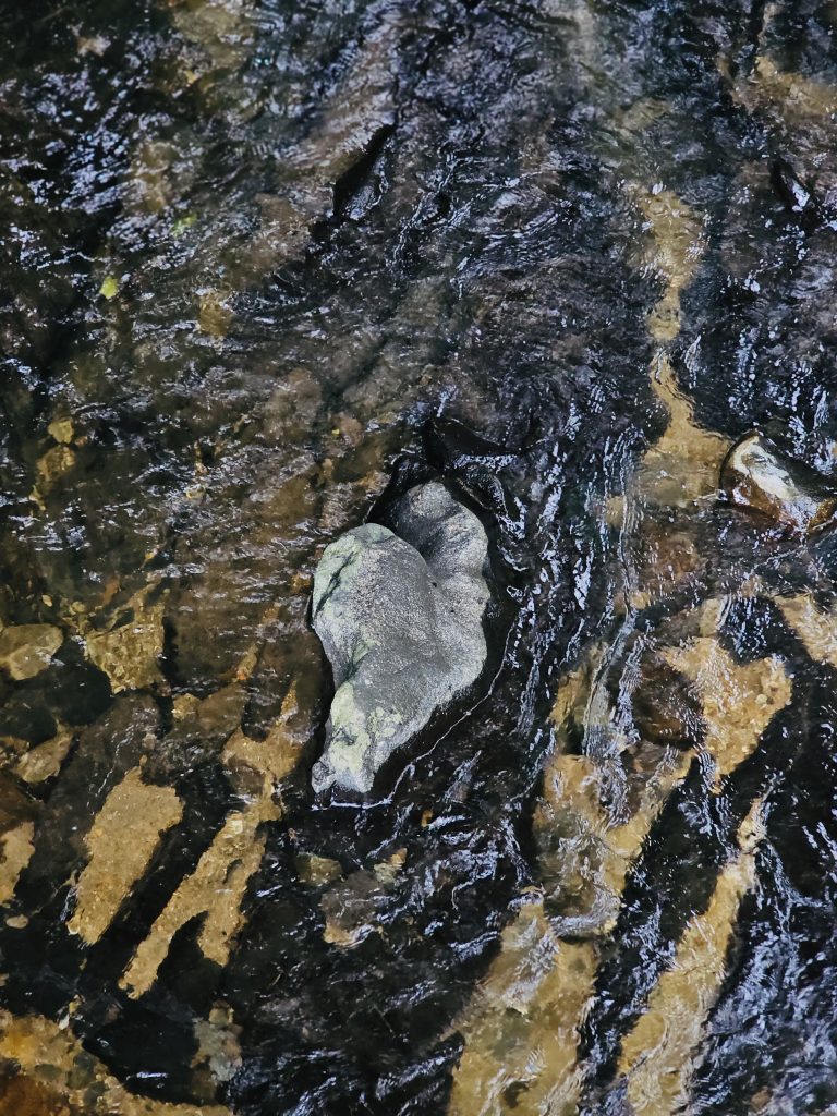Alternative Text: A natural heart-shaped rock sits in the middle of a clear stream, its flowing water revealing visible rocky patterns. Captured at a forest stream near Thusharagiri Falls, Kozhikode, Kerala.