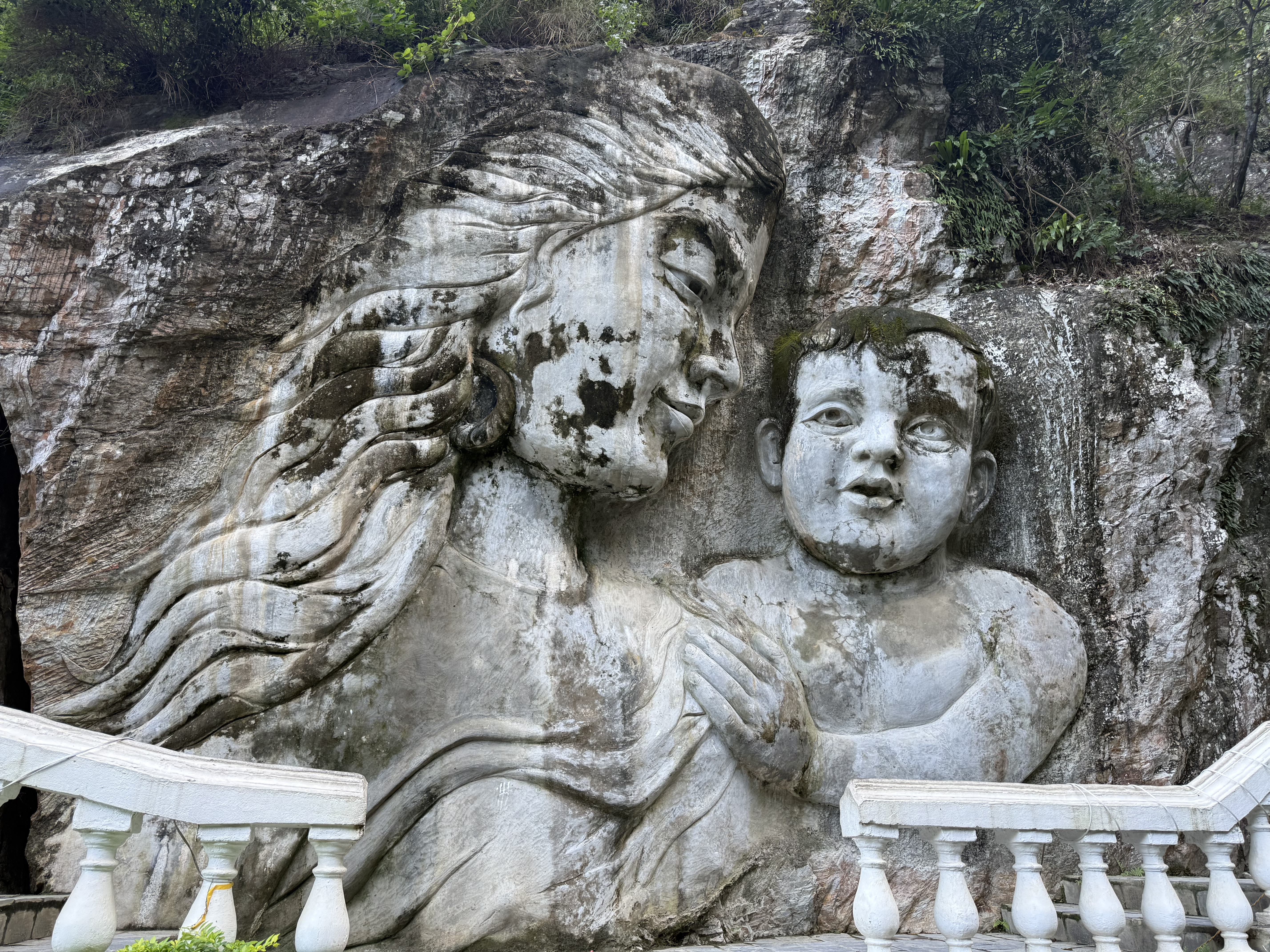 Alternative Text: A large stone carving depicts a woman with flowing hair and a child beside her, both portrayed with soft features.
