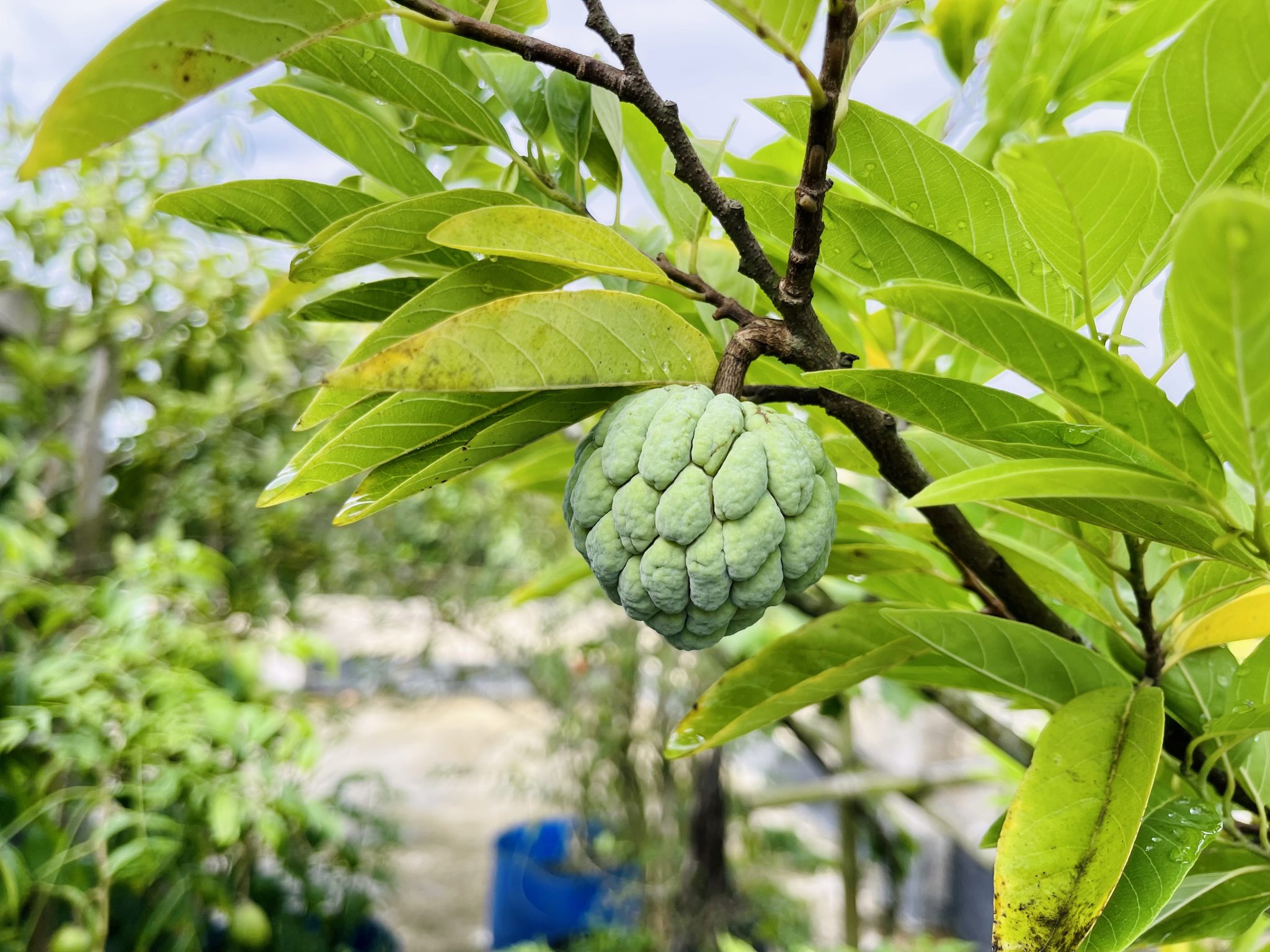 Alternative Text: A green custard apple hangs from a branch surrounded by vibrant green leaves.
