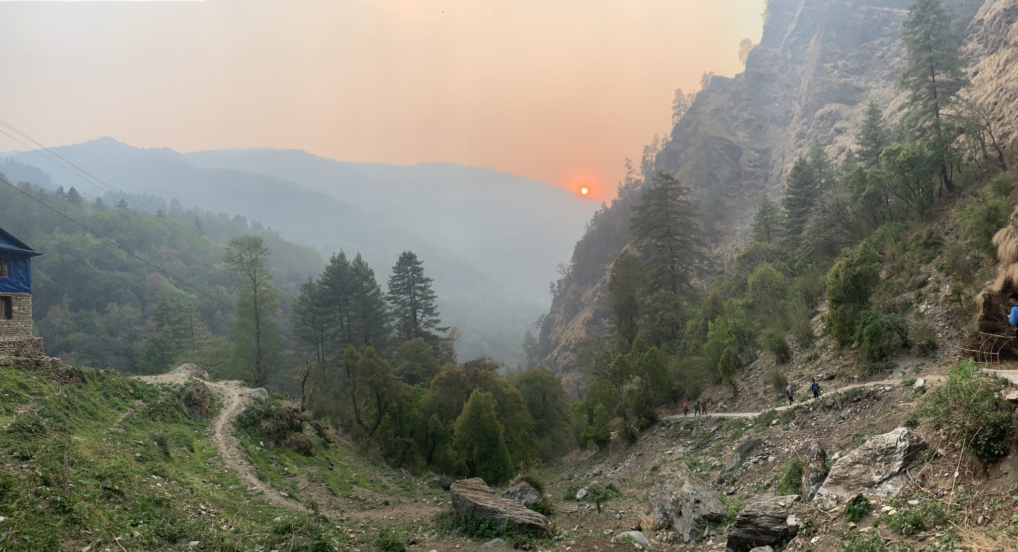 Alternative Text: A beautiful scenic view of the green hilly areas, man walking road, and few pedestrians walking, sunset, nature.