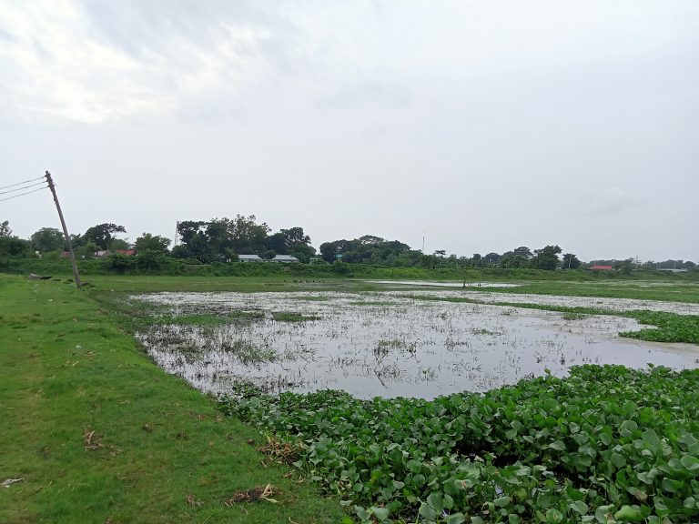 Alternative Text: The picture of a wet land with visible water and gresses on it, on it’s side is the wooden electric pole and few houses on its background. Brahmanbaria, Bangladesh #SummerPhotoContest