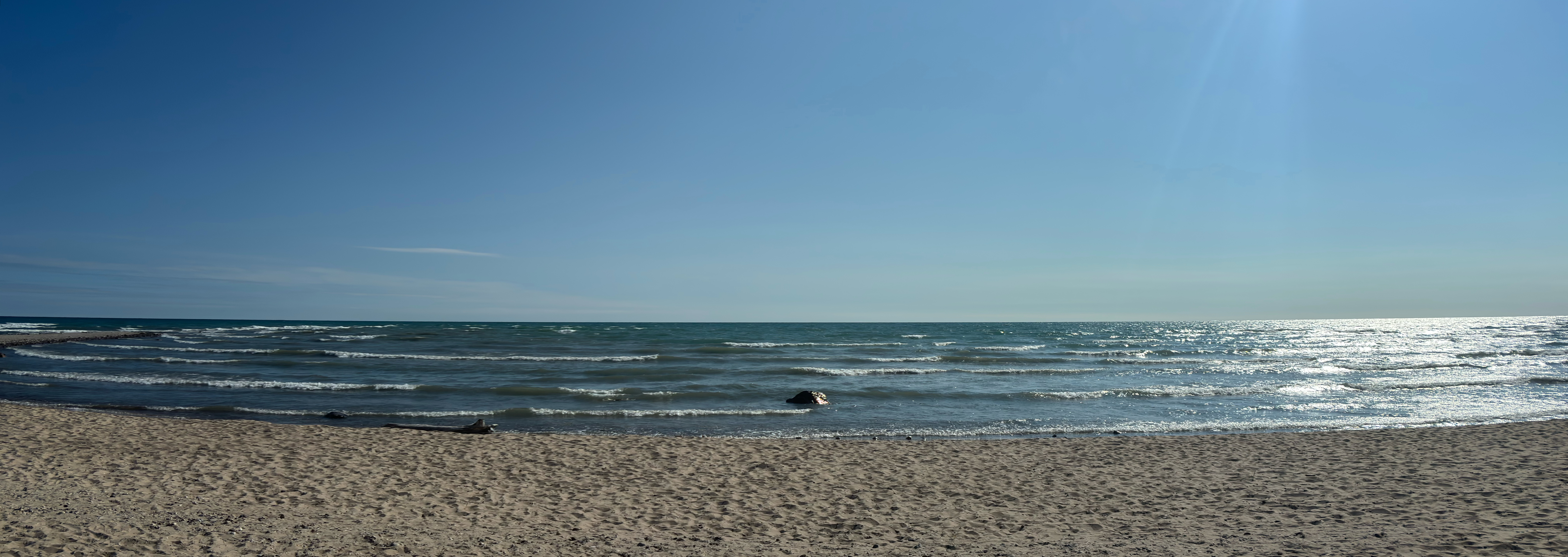 Alternative Text: A wide view of a large body of water with beach sand in the foreground. Lake Huron.