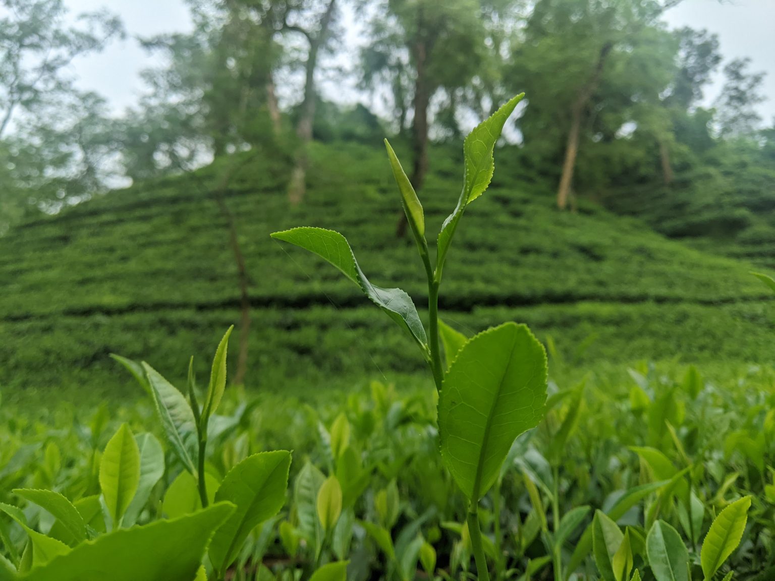 Alternative Text: A close-up of a tender tea sprout with the Sreemangal tea garden blurred in the background