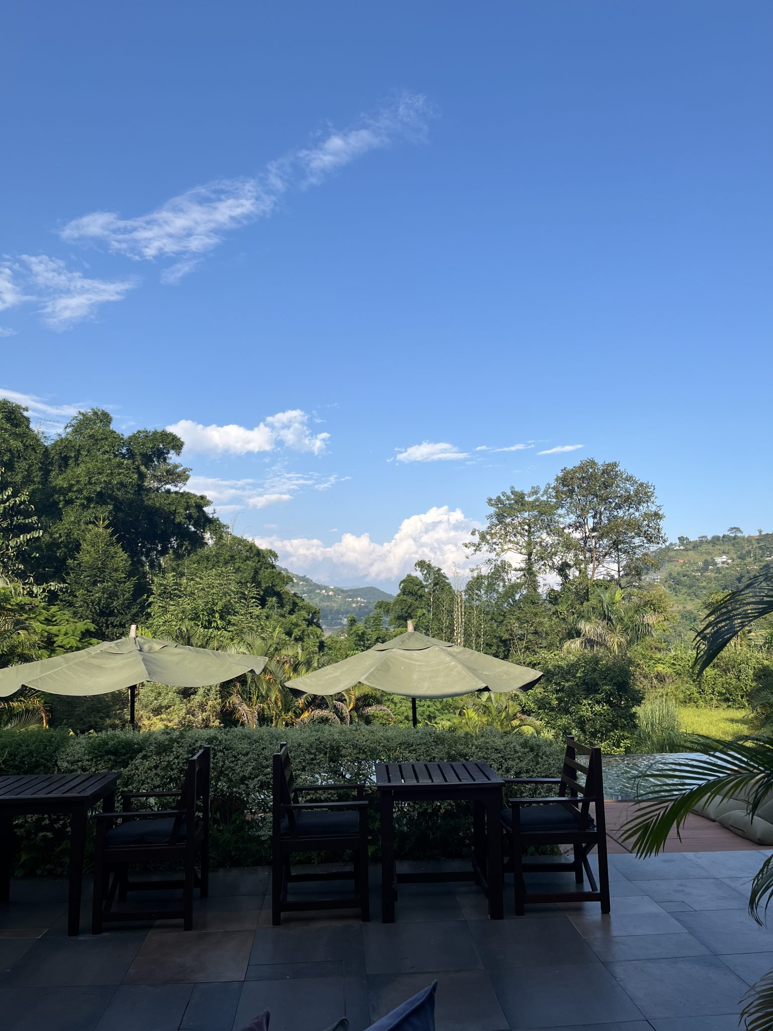Alternative Text: A scenic view showing a vibrant blue sky with a few white clouds. In the foreground, there are dark wooden tables and chairs arranged outside.