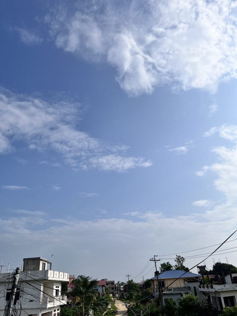 Alternative Text: A clear sky with scattered white clouds over a residential area. In the foreground, there are several houses with varying architectural styles, and lush greenery is visible.