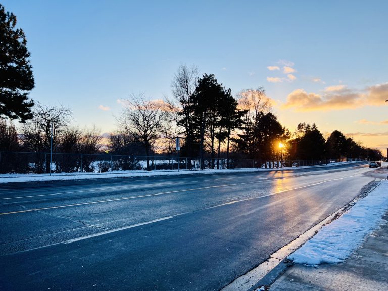 Alternative Text: A snow-covered road lined with trees, viewed during sunset.