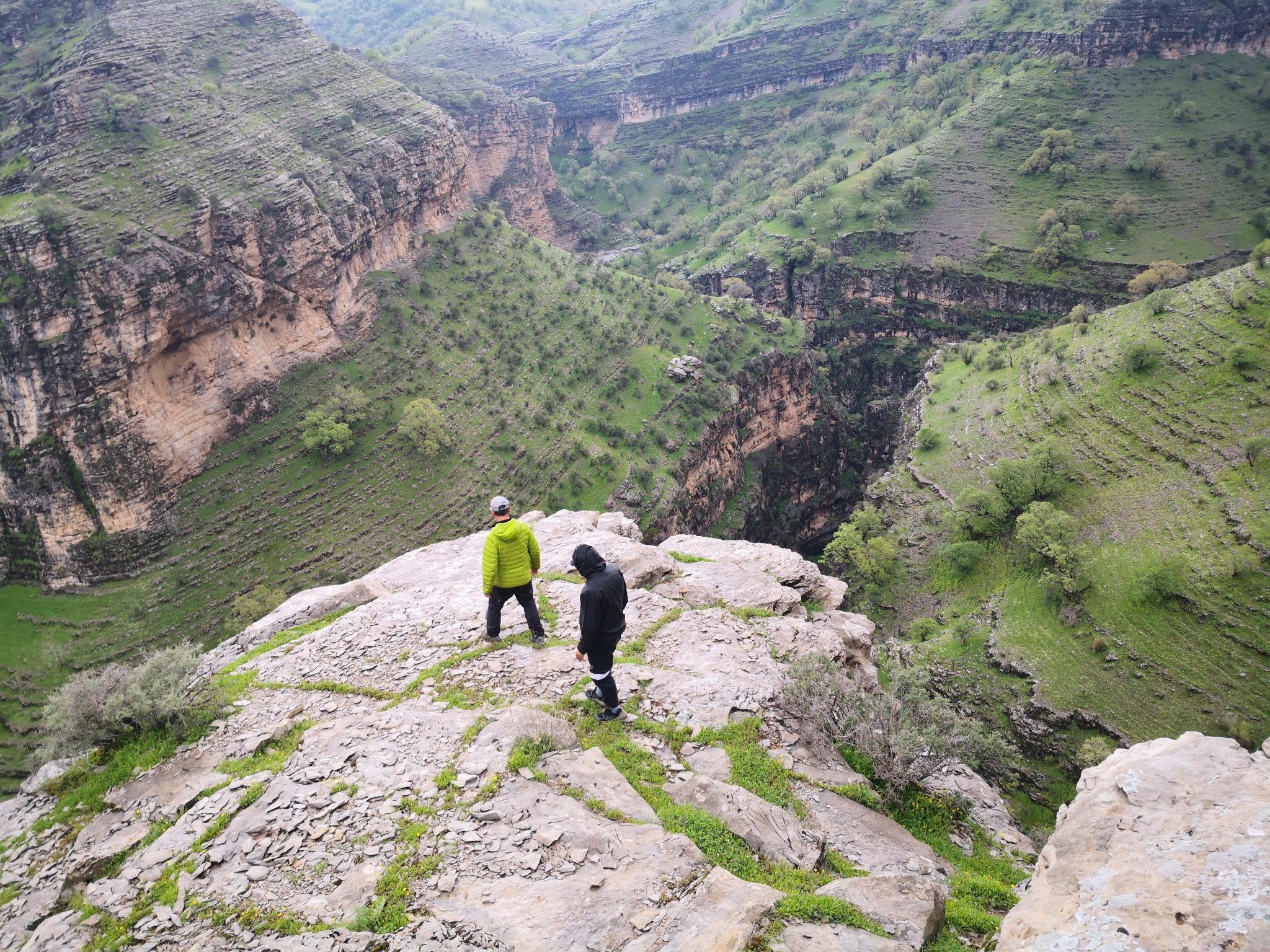 Alternative Text: Two people stand on a cliff overlooking a green canyon with rocky mountains and steep slopes.