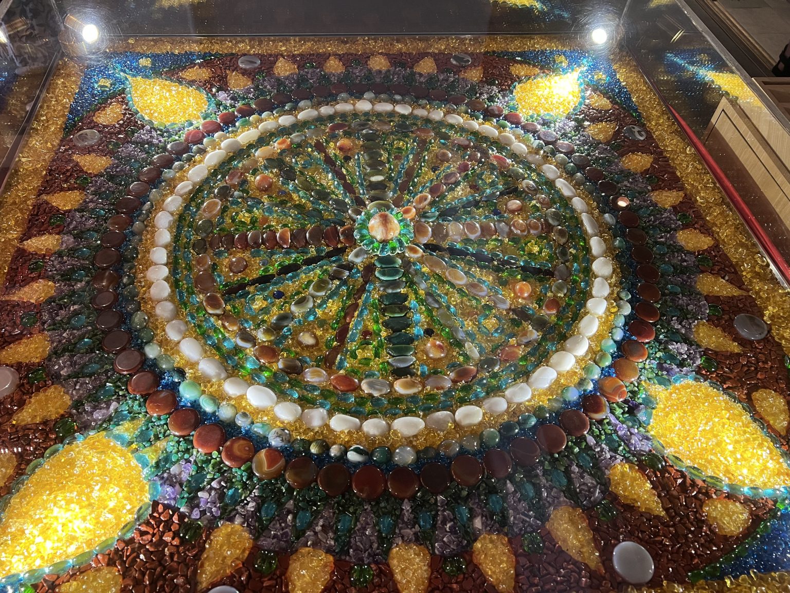 Alternative Text: A close-up, overhead view of a large, intricate circular mosaic or mandala made entirely of colorful polished stones, crystals, and glass pieces.