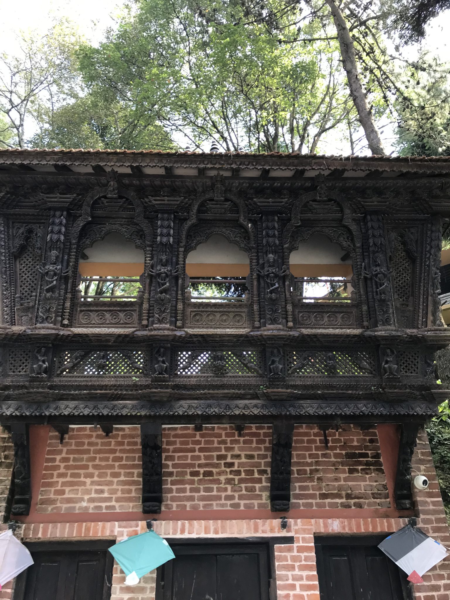 Alternative Text: A traditional Nepalese-style building with intricate wooden carvings on its upper balcony. The building has a brick base, and some kites are visible hanging below the balcony.