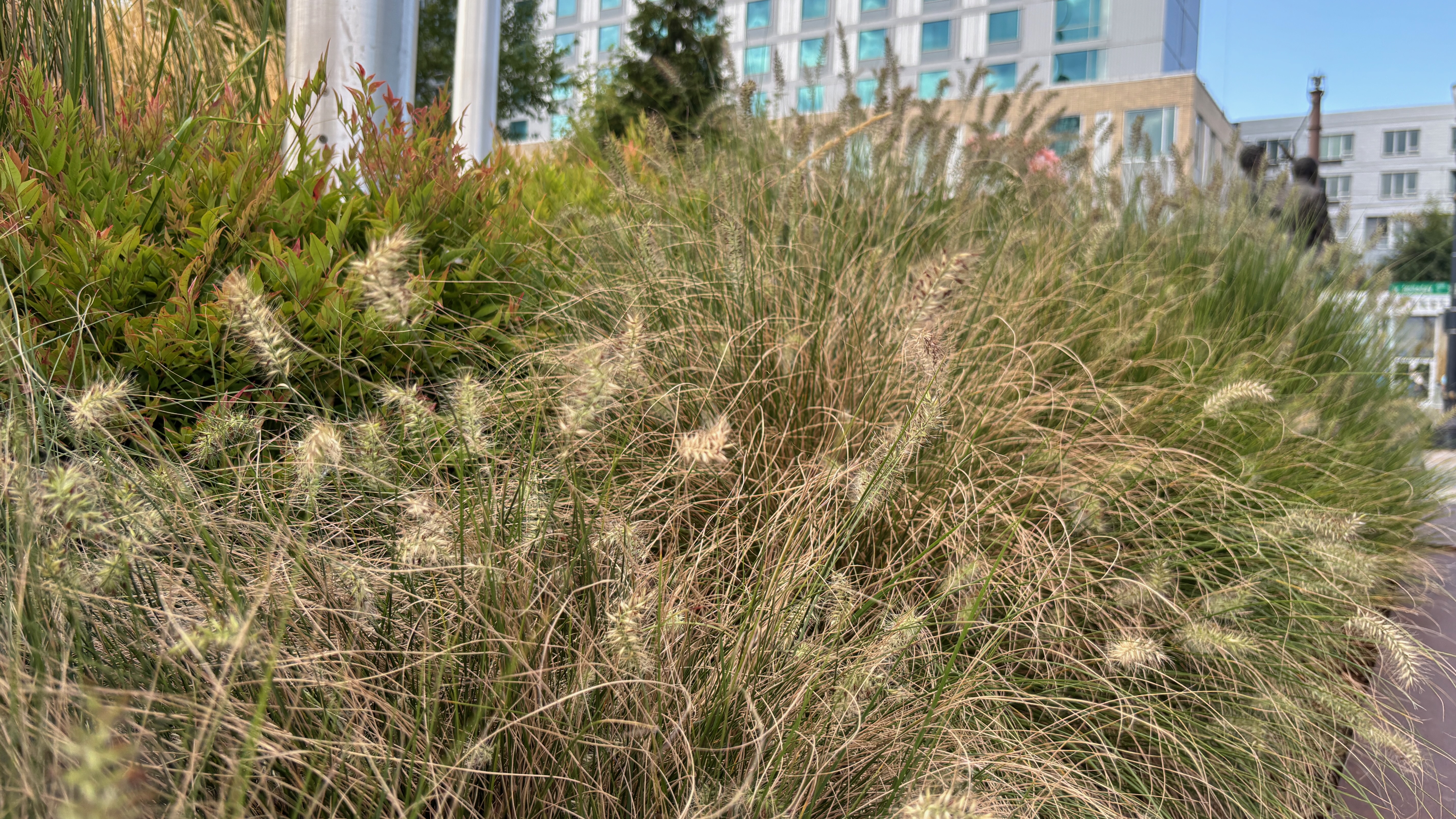 Alternative Text: Closeup of tall grasses with seeded heads. A building is in the background.