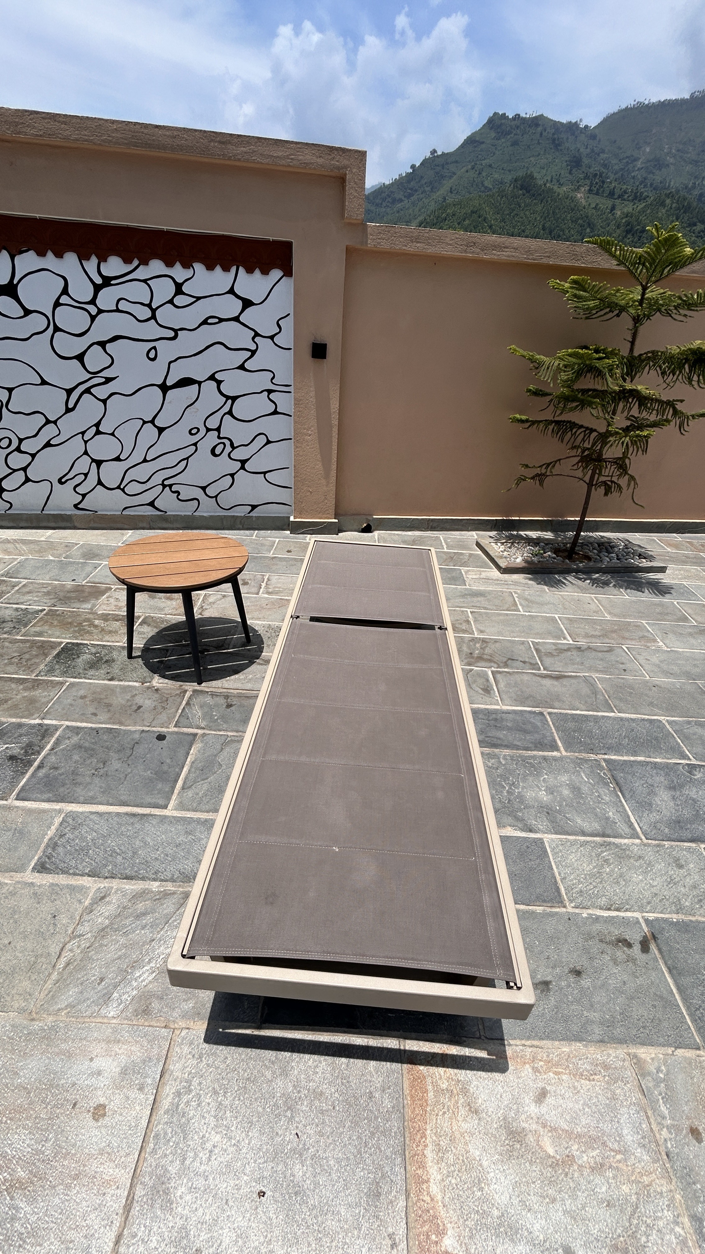 Alternative Text: A patio area featuring a stone floor, a low round wooden table with black legs, and a long, gray lounge chair positioned horizontally.