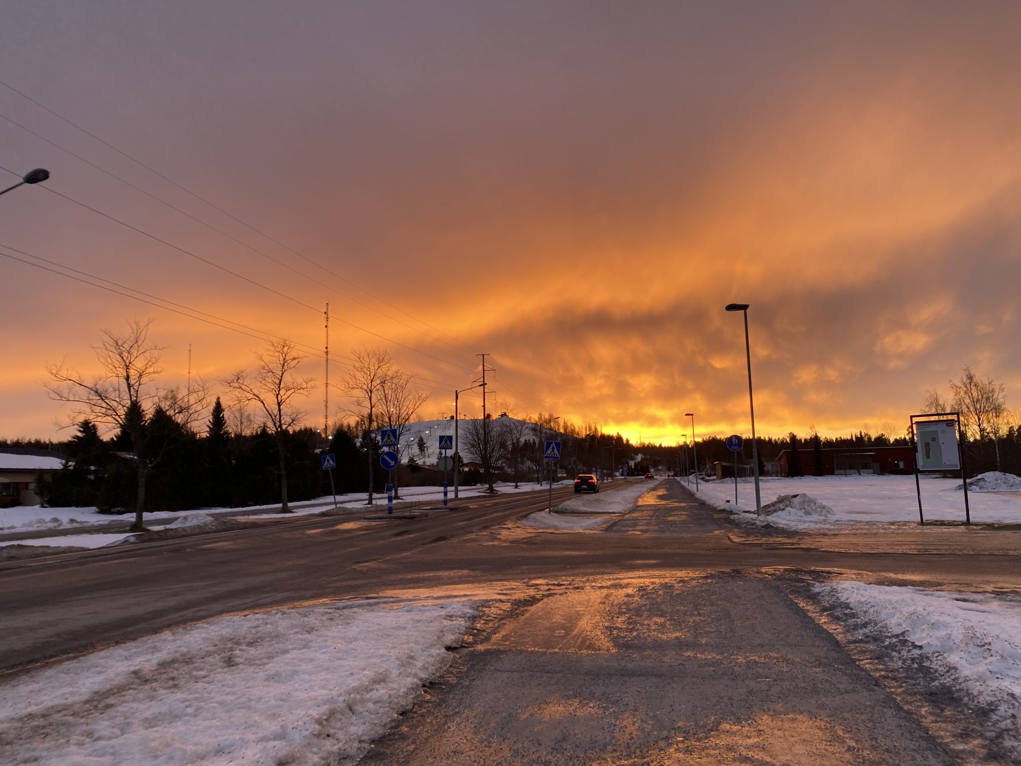 Alternative Text: A snowy street at sunset, with warm orange light glowing across the sky and reflecting on the icy road