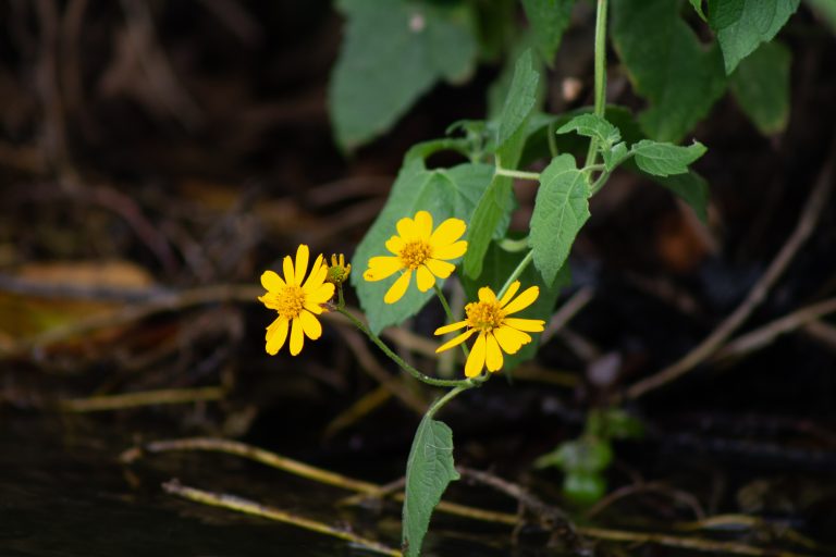 Alternative Text: A close-up image of three bright yellow flowers with a bushy, green background.