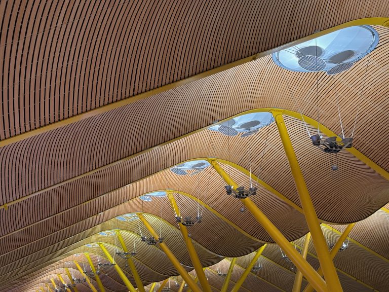 Alternative Text: A close-up view of the Madrid airport ceiling, featuring a series of undulating wooden panels with vertical grooves.