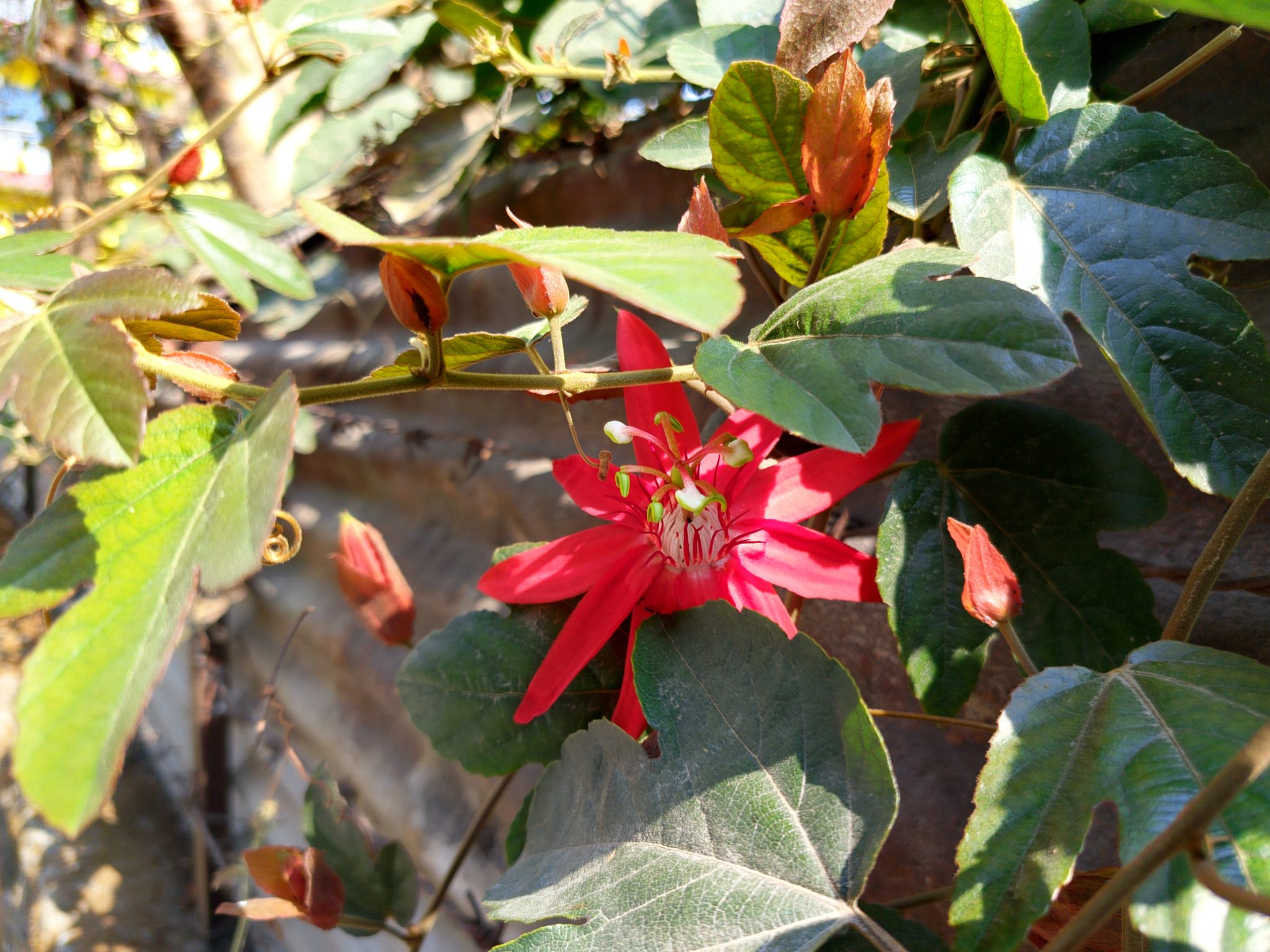 Alternative Text: A vibrant red flower with elongated petals is nestled among green leaves and buds