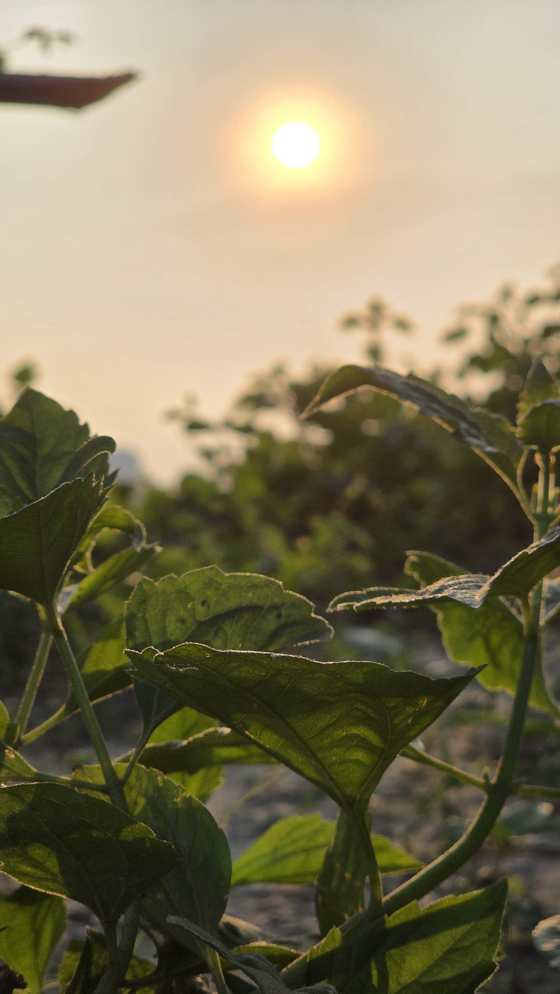 Alternative Text: A photograph of golden hour, sunset view through bush leaves. The sun looks bright yellowish golden and looks like an orange halo around. Focus is on some close leaves.
