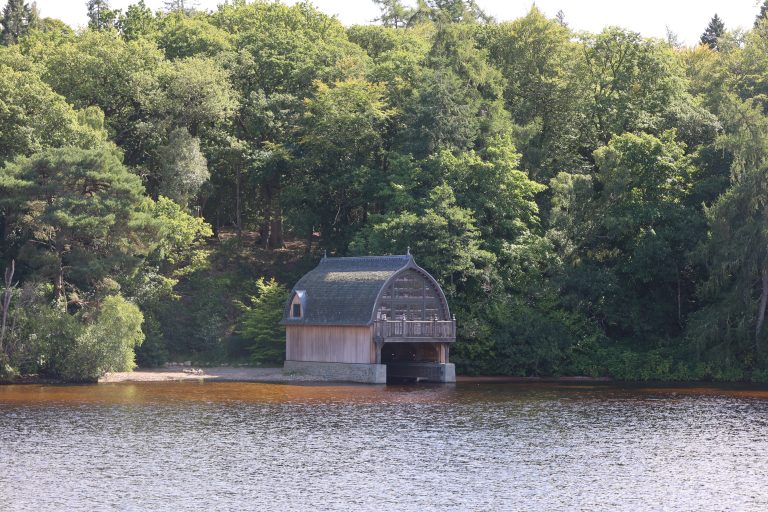 Alternative Text: Aldourie Castle’s wooden boathouse with a slate roof sits by Loch Ness on a sunny day.