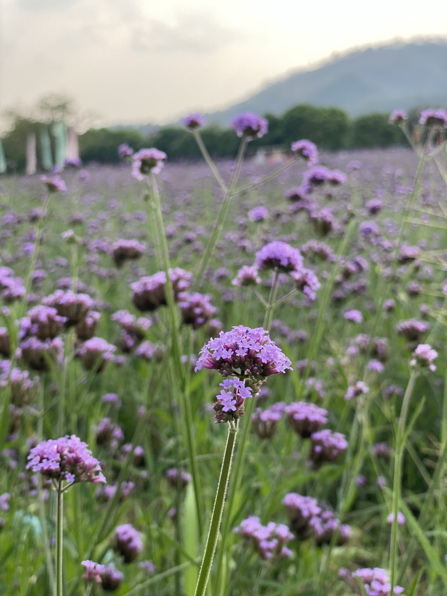 Alternative Text: Close-up view of purple wildflowers blooming in a field, with soft-focus greenery and distant mountains under a gentle sky.
