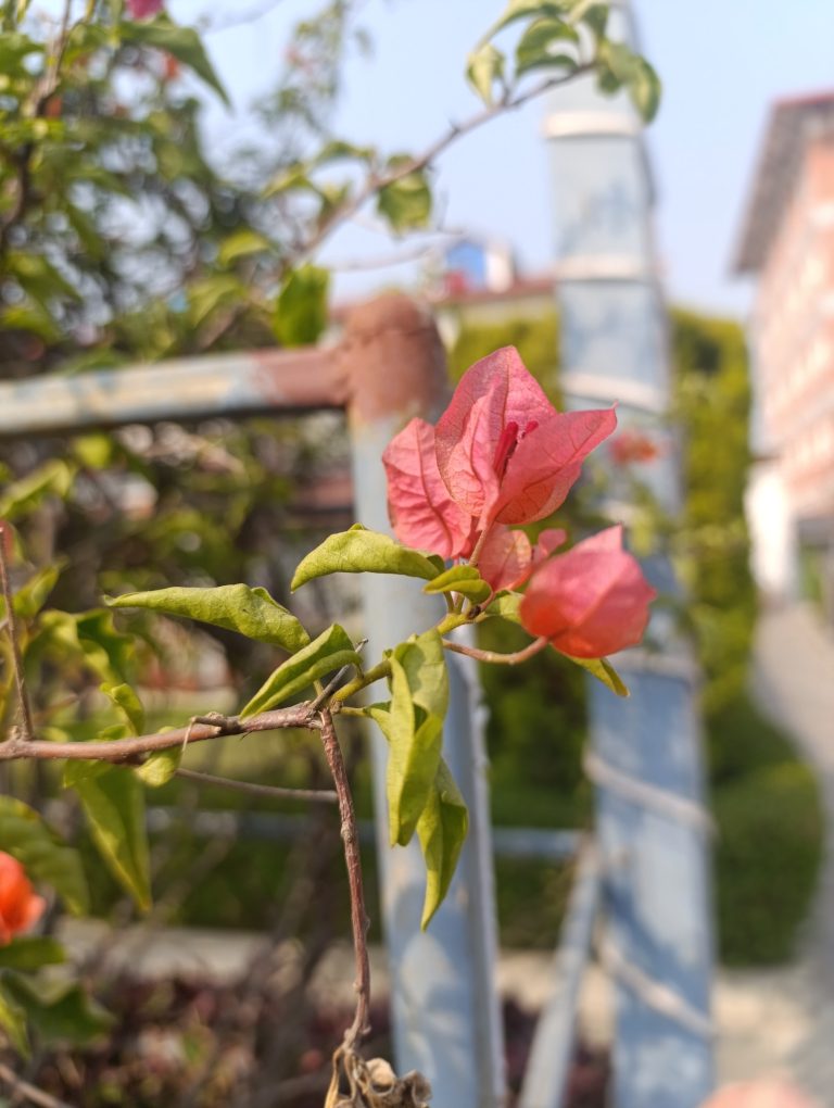 Alternative Text: A close-up of a flowering plant with delicate pink and reddish petals against green leaves.