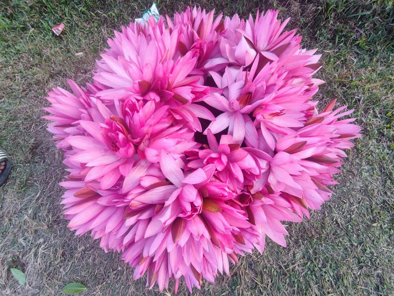 Alternative Text: A dense cluster of vibrant pink flowers, resembling water lilies, is arranged in a circular shape.