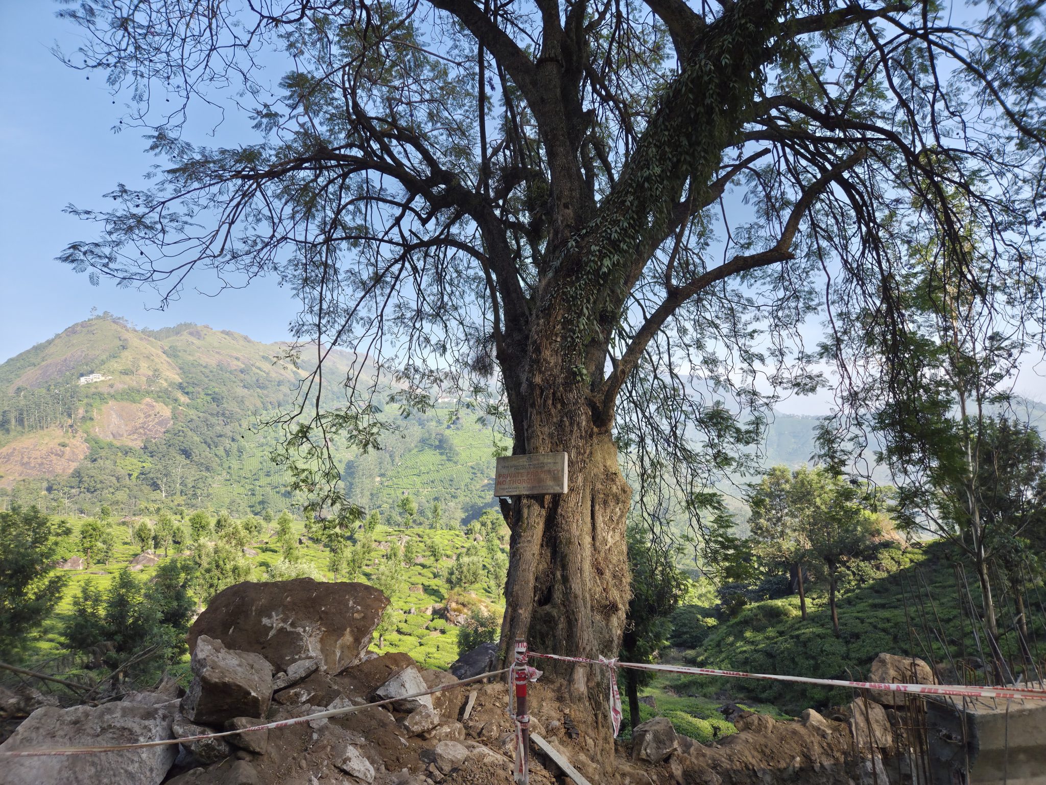 Alternative Text: A big tree with an old sign on its trunk stands in front, with green terraced fields and hills stretching behind it.
