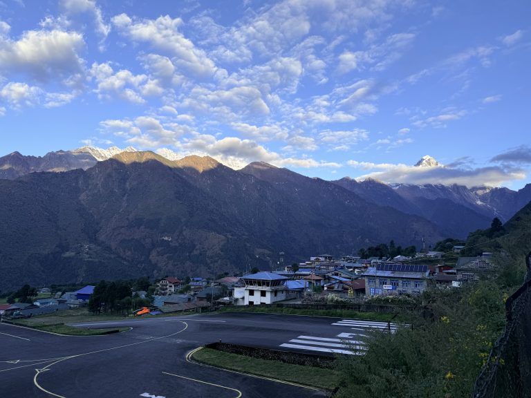 Alternative Text: A small colorful town with a curved runway in the foreground, set below dramatic snow-capped mountains under a partly cloudy sky.