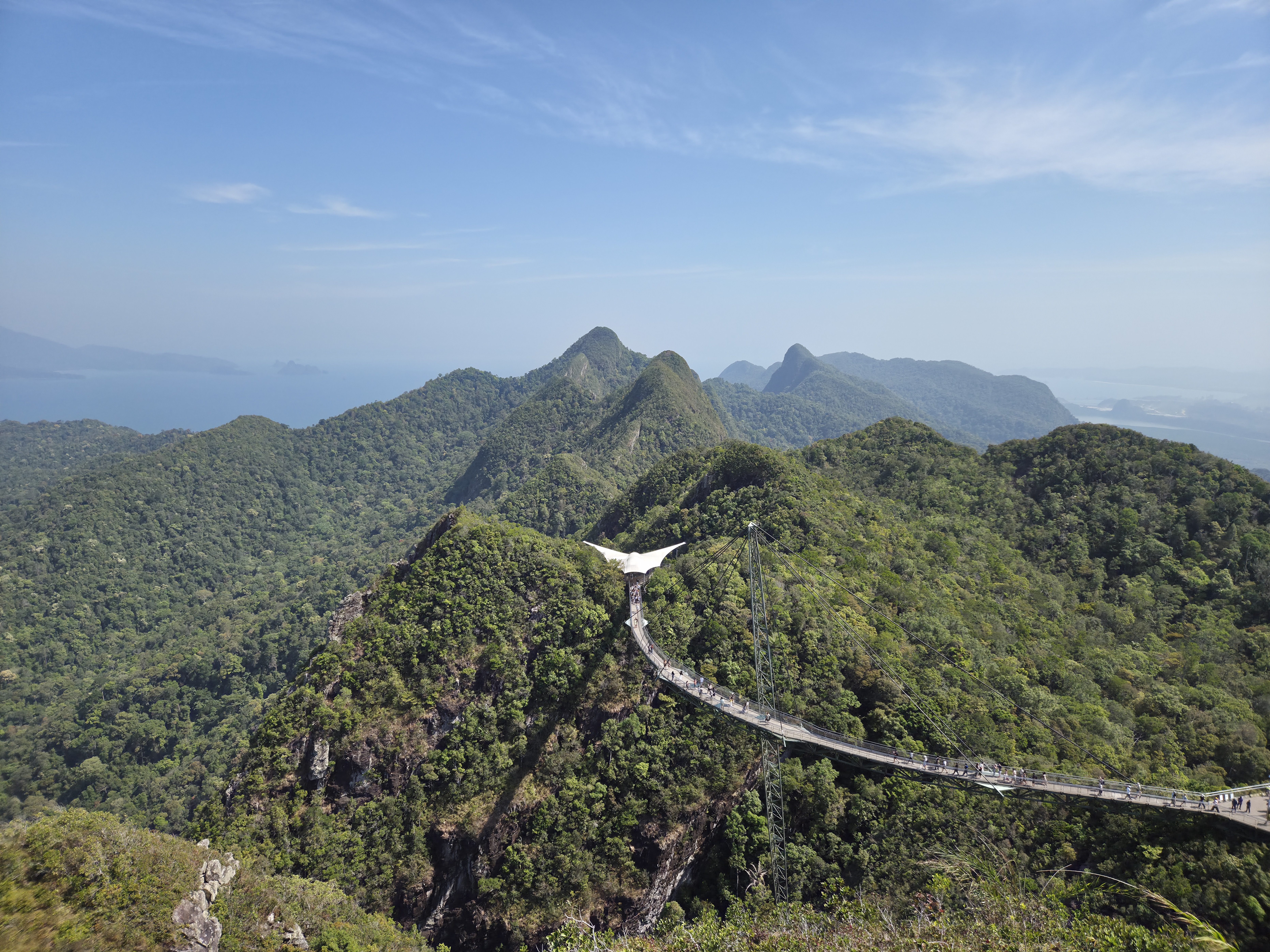 Alternative Text: A panoramic view of lush green mountains under a clear blue sky. In the foreground, a long, curved pedestrian walkway extends over the treetops, leading to a striking, white, sail-like canopy structure.