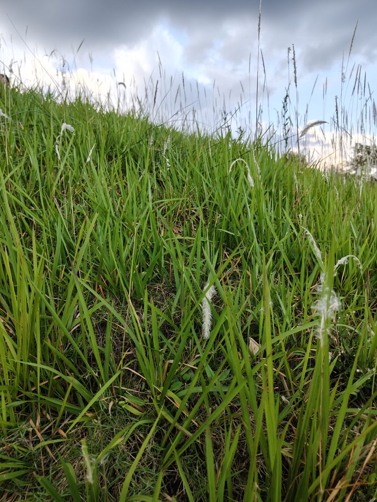 Alternative Text: A close-up view of a grassy hillside, featuring vibrant green grass and some scattered tall grasses.