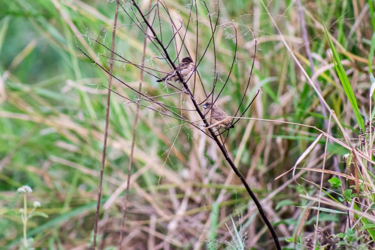 Alternative Text: Two small birds are perched on a thin, bare branch amidst tall grass and foliage.